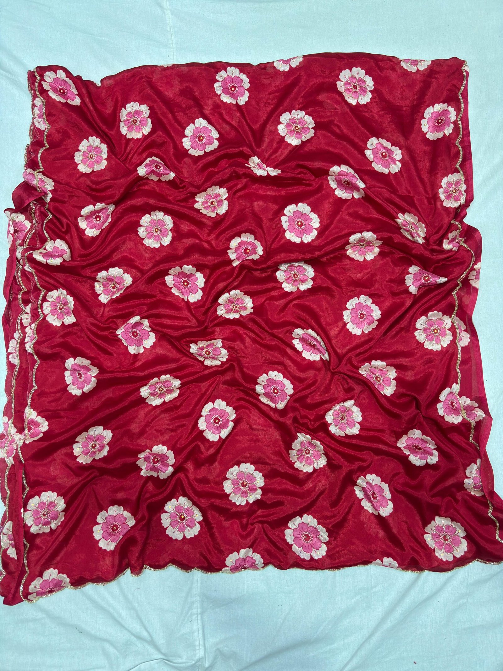 Made from soft and elegant Chinon fabric, this saree features a graceful floral meel print that adds a fresh and modern touch. The handwork detailing on the border, pallu, and buttas brings a handcrafted charm that makes it perfect for both festive and casual occasions.